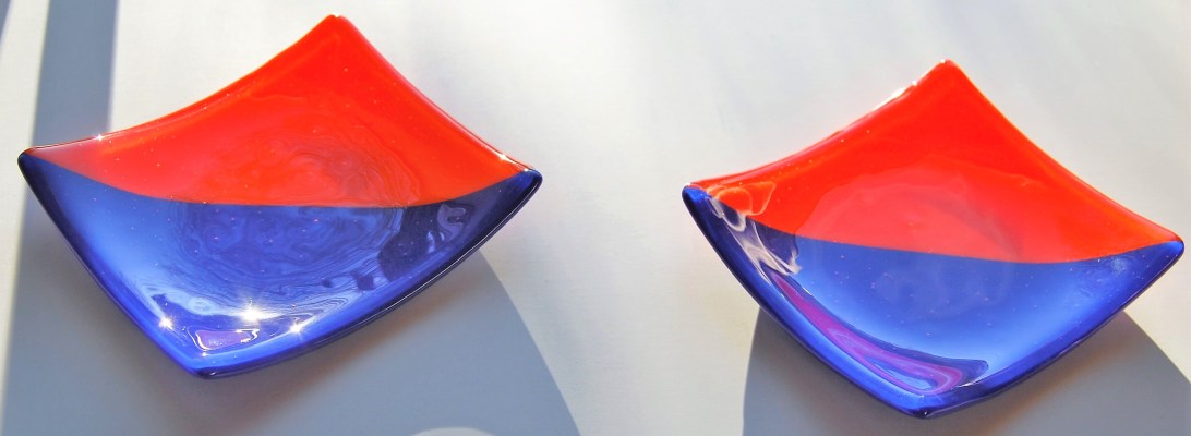 The prospect of combining beautiful amber glass with irridiscent and opaque blues in a new set of small plates felt like a good idea…and they turned out good.